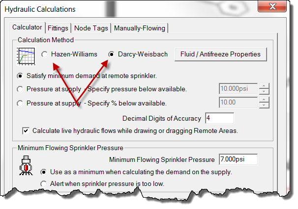 Calculations can be run using either method simply by switching between Darcy-Weisbach and Hazen-Williams: