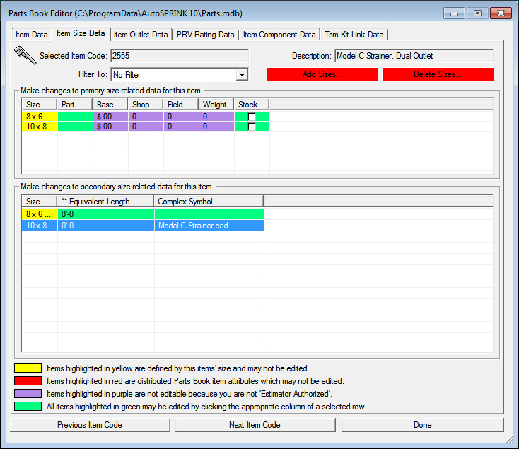 go to the Item Size Data Tab
