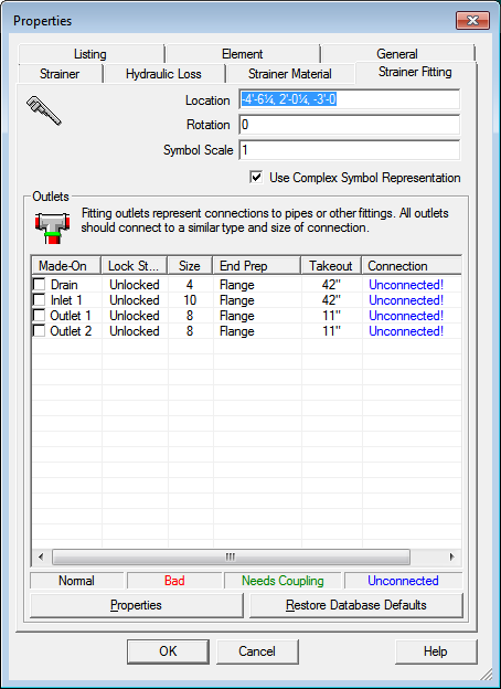 Hydraulically, in this example of a new Strainer, it does flow out of both outlets and reports it’s node at the center of the fitting.